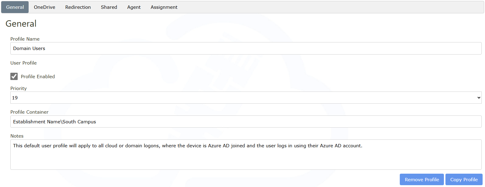 This feature enables you to organise multiple profiles into a grouped container, simplifying the administration of profiles in a tree view menu. You can either select an existing container from the list, or type a new name to create one automatically. Additional sub-containers can also be created, separated using a backslash, for example: Establishment Name\South Campus.