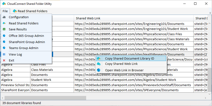 We have built the CloudConnect Utility, which is a standalone tool that can be used to query your Microsoft tenant to retrieve all of your Document Libraries IDs and Web Link URLs for all locations and export them to an excel file.